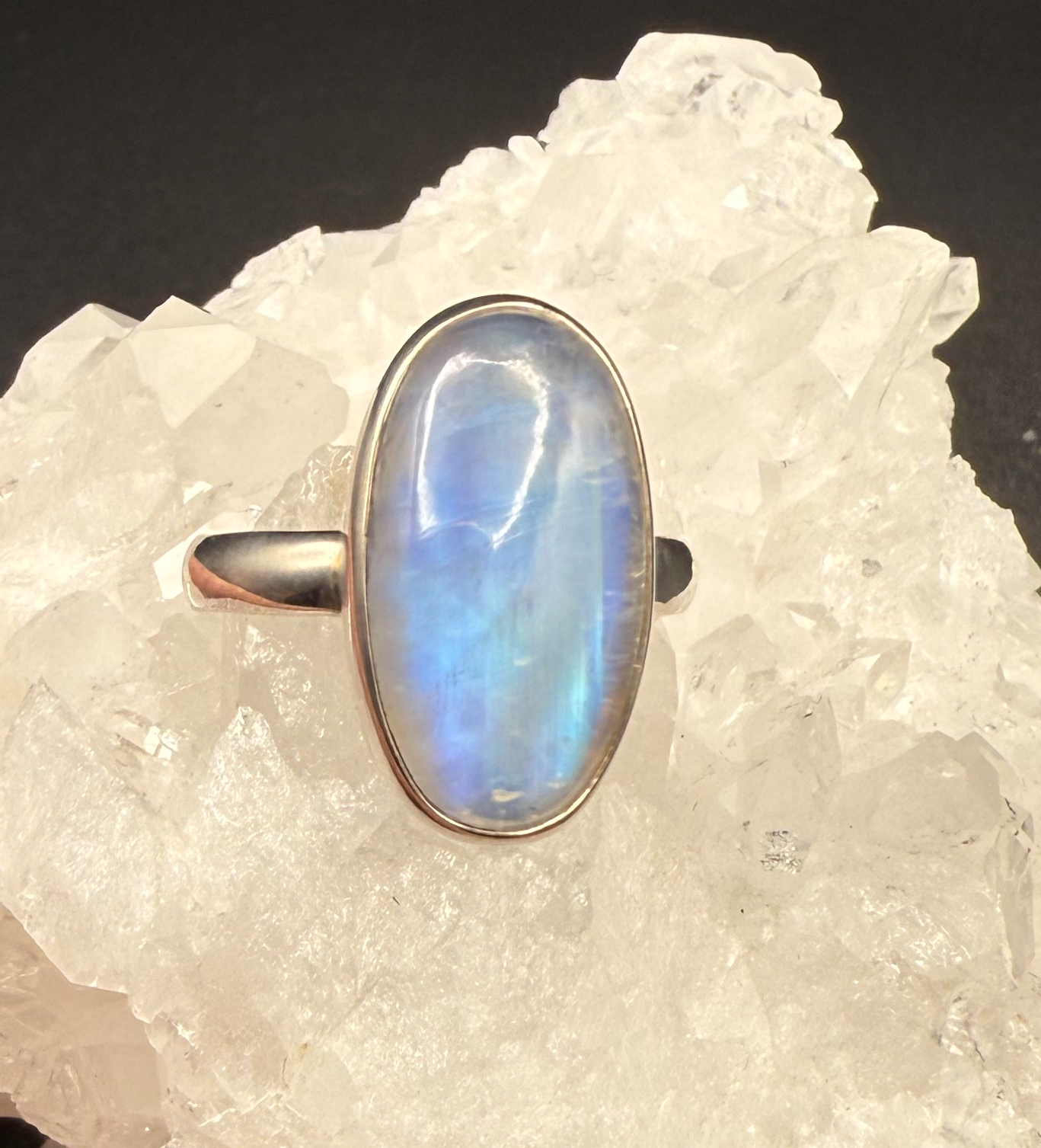 This ring is a beautiful statement piece. Oval in shape and set in .925 Sterling Silver, size 9. This is a ring that is eye catching from every direction. Blue Fire Moonstone is a rare and healing crystal that has a blue glow and feminine energy. It's a stone of new beginnings, growth and creativity. It's also know for its calming, soothing and protective properties. This is a natural crystal. Every crystal is unique, making each piece one of a kind. Only 1 in stock.