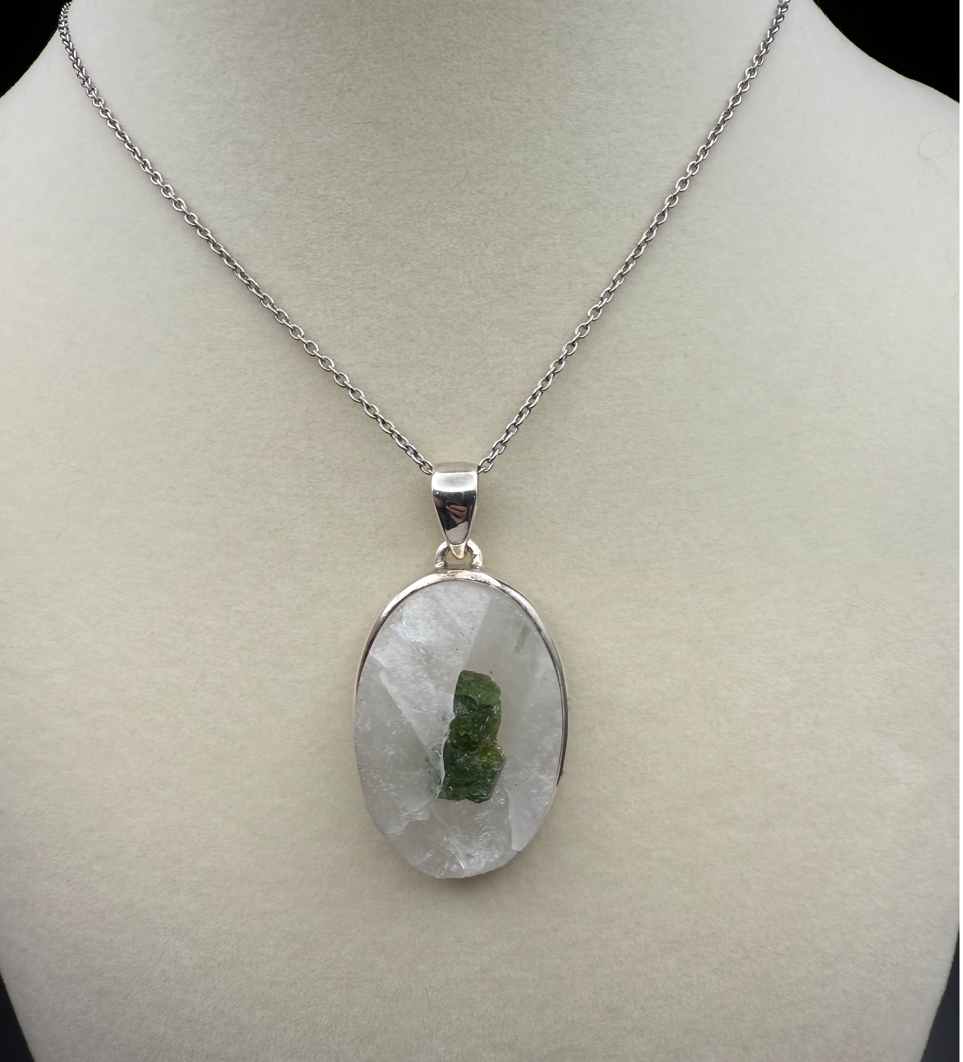 This is a large oval clear quartz pendant with a green tourmaline inclusion set in .925 Sterling Silver. This is a fascinating and beautiful combination. Quartz is a common mineral, but when it contains inclusions like green tourmaline, it becomes a unique and valuable specimen. These inclusions can create stunning visual effects, making each piece one-of-a-kind. Green tourmaline, also known as verdelite, is known for its vibrant energy and healing properties. It promotes compassion, tenderness, and patience, and is believed to assist with self-healing and visualizations. When combined with clear quartz, which is a master healer and amplifier of energy, the result is a powerful and visually striking crystal. This is a natural crystal. Each crystal is unique, making each piece one of a kind. Only 1 in stock.